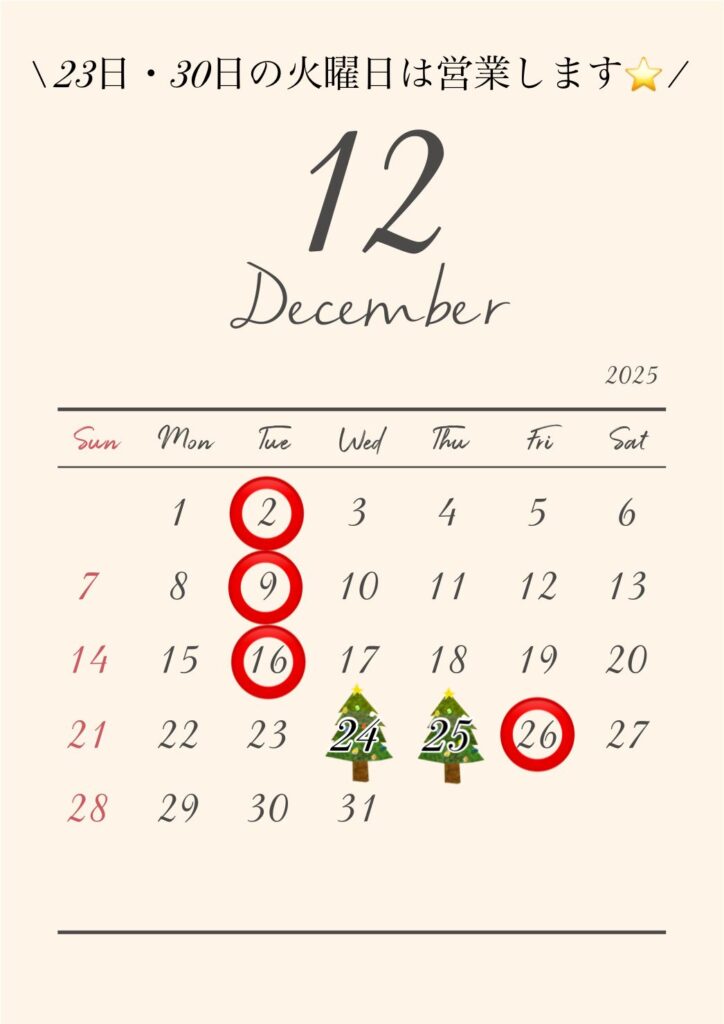 12月の休業日は12月2日(火)・9日(火)・16日(火)・26日(金)の4日間です。